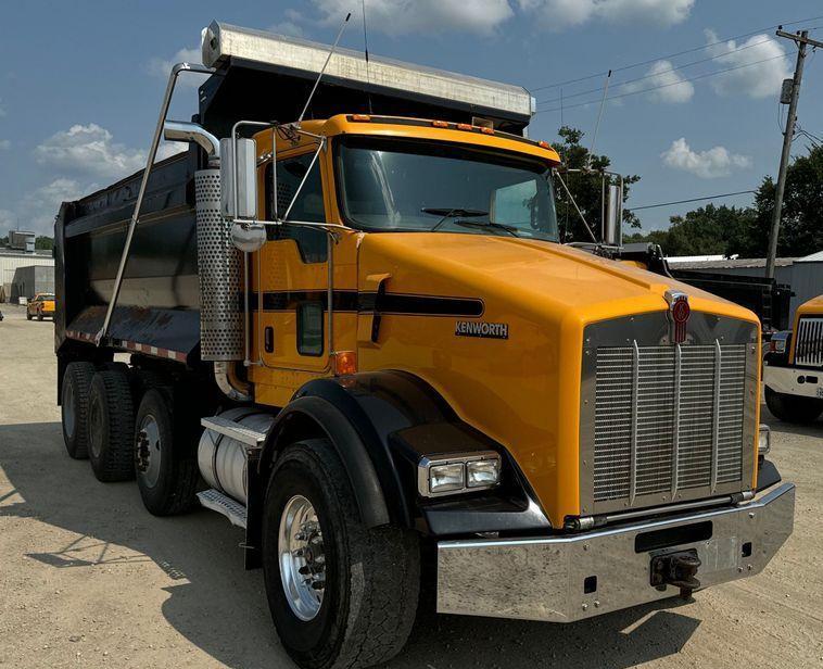 The 2006 Kenworth T800 dump truck has 568,259 miles and 31,685 hours on the meter. It's equipped with a Caterpillar C13 Acert engine, a 6-cylinder diesel engine with an engine brake. The truck features an Eaton Fuller 8LL manual transmission with 10 speeds. The chassis has a triple axle setup with a steerable pusher axle, full differential lock, and spring-over walking beam suspension. The GVWR is 64,500 lbs. The dump bed is made by Crysteel, measuring 17' x…