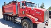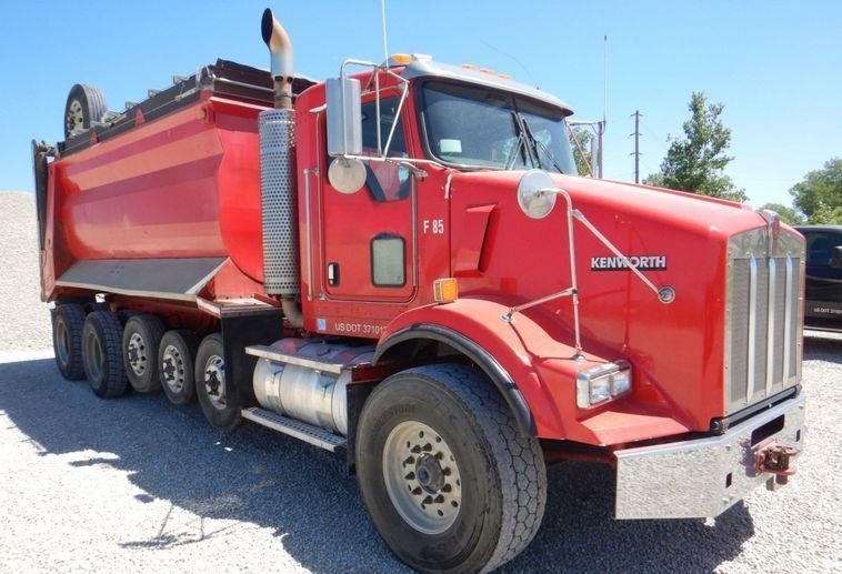 The 2008 Kenworth T800 dump truck has 607,088 miles on the odometer. It is equipped with a Cummins ISM-350V 10.8L inline-6 diesel engine with an engine brake, paired with an Allison automatic transmission.