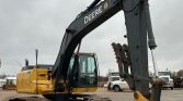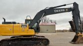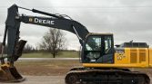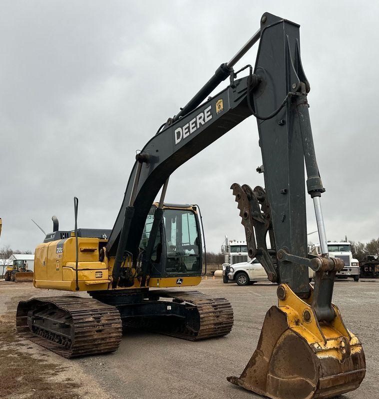 The 2015 John Deere 210G LC excavator has 2,063 hours on the meter. It’s powered by a 6-cylinder, 6.8L John Deere 6068HT diesel engine with hydrostatic transmission and two-speed travel. The enclosed cab includes AC, heat, and a pattern changer. Features include a standard boom, a 9′ 6″ stick, a manual thumb, and a 36″ wide bucket with 5 teeth. The steel tracks are 31.5″ wide with triple grouser pads.