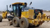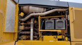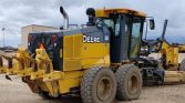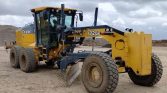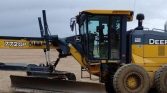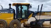 The 2015 John Deere 772G motor grader shows 10,758 hours on the meter. It is powered by a John Deere six-cylinder diesel engine. The transmission is Powershift with 8 forward and 8 reverse gears. The chassis features all wheel drive and a differential lock. The operator’s station is an enclosed cab with AC, heat, hydraulic control valves, and a backup camera.