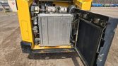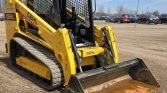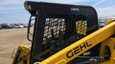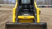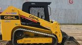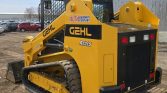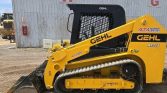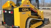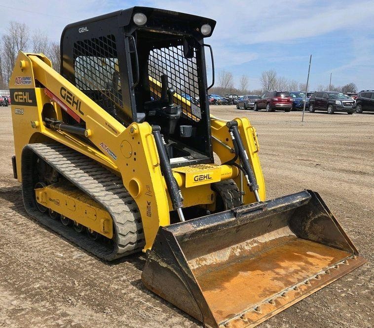 This 2021 Gehl RT215 tracked skid steer loader has 1,472 hours on the meter and is powered by a 4-cylinder Yanmar 4TTNACJ diesel engine with a displacement of 3.319 liters. It features a hydrostatic transmission with two-speed travel and an open ROPS operator station.