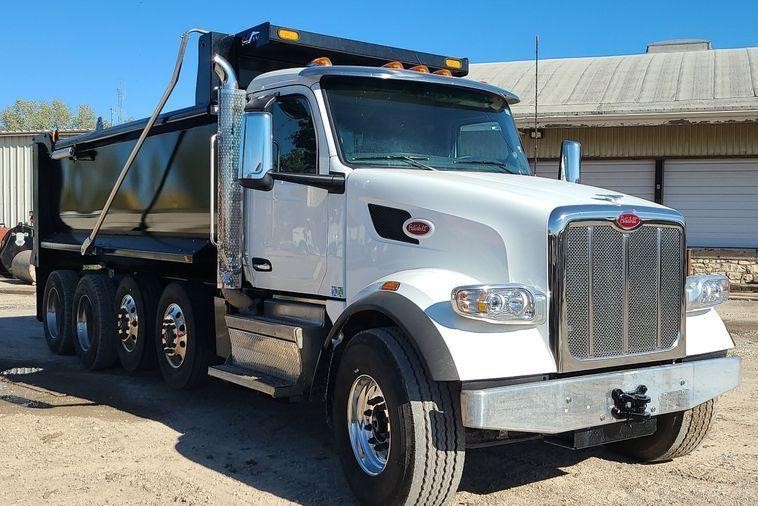 2023 Peterbilt 567 dump truck Miles: 31,349 on odometer Engine Cummins X15 Displacement 14.9L Cylinders 6 Fuel type Diesel Transmission Automatic Chassis Axles 4 Pusher axle Differential lock Full Suspension Spring over walking beam Brakes Air PTO GVWR 85,000 lbs Interior AC Heat Power windows Cruise control Features Dump bed Load King LK18DB077 Capacity 22 cu. yd. 18' L x 96" W Side height 58" Bed type Steel Barrel Ram Single End gate Air operated Tires 425/65R22.5 Lift…